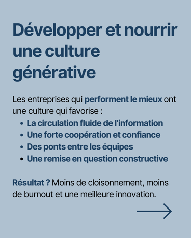 - Développer et nourrir une culture générative : J'ai développé ce concept dans un post précédent, mais pour ceux qui me lisent pour la première fois, c'est une mesure de la culture organisationnelle basée sur une typologie développée par le sociologue Ron Westrum. Je vous invite à lire le post.