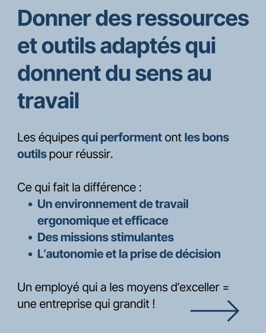 - Mettre à disposition des ressources et outils adaptés qui donnent du sens au travail : Cette mesure de la satisfaction professionnelle concerne le fait d'effectuer un travail stimulant et utile, et d'être habilité à exercer ses compétences et son jugement. Il s'agit également de disposer des outils et des ressources nécessaires pour bien faire son travail.