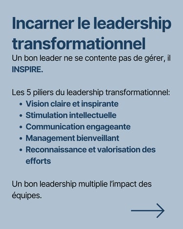 - Adopter un leadership transformationnel : Ceci concerne les managers et se compose de cinq facteurs : la vision, la stimulation intellectuelle, la communication engageante, le soutien et la bienveillance des managers, et la reconnaissance personnelle.