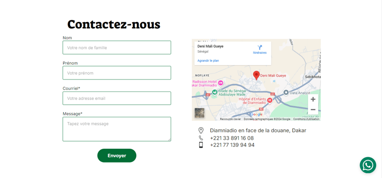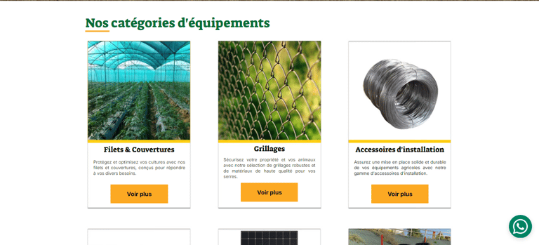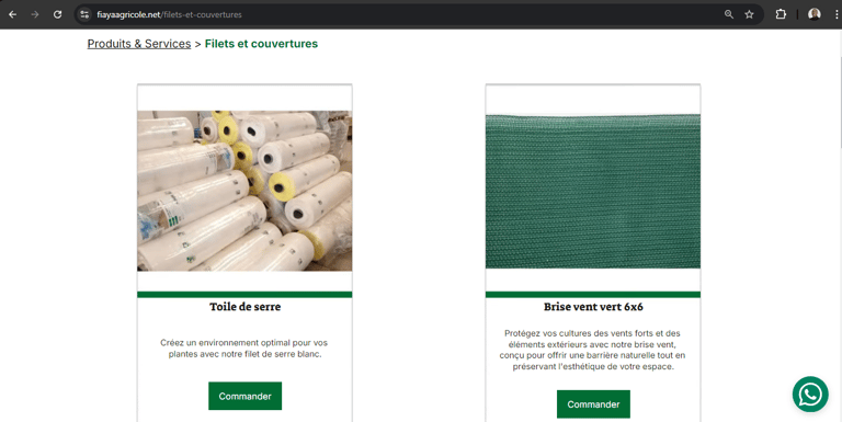 Intégration avec WhatsApp : Pour simplifier les commandes et améliorer les relations clients, nous avons ajouté un bouton flottant sur toutes les pages du site, permettant de contacter directement l'entreprise via WhatsApp. Chaque produit dans le catalogue peut également être commandé via un bouton dédié qui envoie une demande directement sur l'application.