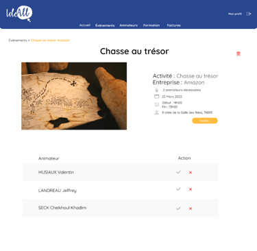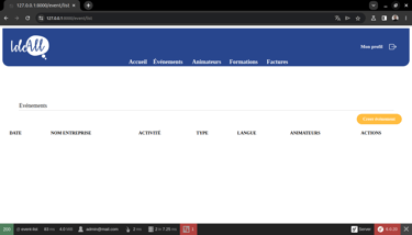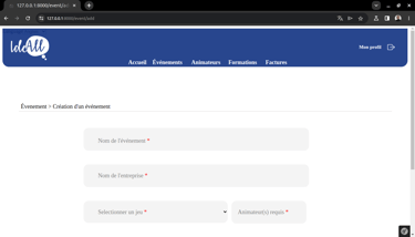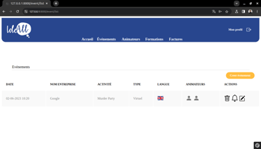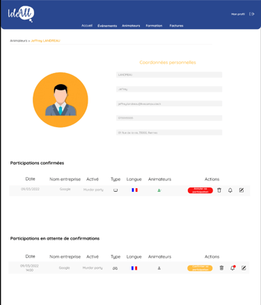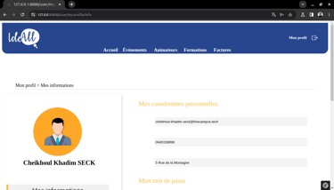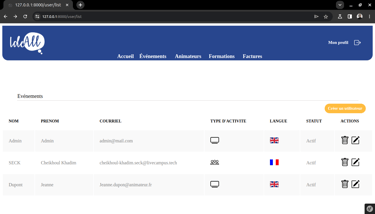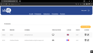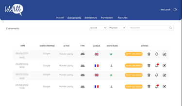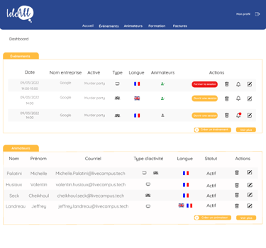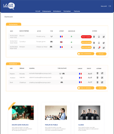 Pendant ma formation à Livecampus, j'ai eu l'opportunité de collaborer avec IdeAll, une agence événementielle B2B, sur un projet stimulant qui avait pour objectif de faire évoluer leur processus de gestion interne. En équipe réduite, j'ai participé à la conception et au développement d'un site web dynamique, facilitant la gestion des événements, la coordination des animateurs et l'automatisation de la facturation. Nous avons créé une interface utilisateur intuitive afin de considérablement optimiser leurs opérations.