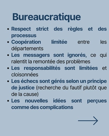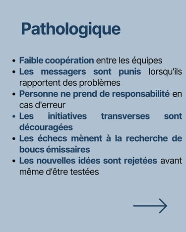 Culture Pathologique (Pouvoir & Contrôle) : Une organisation où l’information est utilisée comme une arme, la collaboration est faible et les erreurs sont sanctionnées plutôt qu’analysées. La peur et la recherche de boucs émissaires freinent l’innovation et la performance.