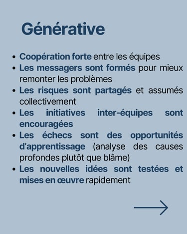 Culture Générative (Apprentissage & Performance) : Un environnement où la transparence, la collaboration et l’expérimentation sont encouragées. Les erreurs servent d’apprentissage, les équipes sont responsabilisées et l’innovation est un moteur de croissance.
